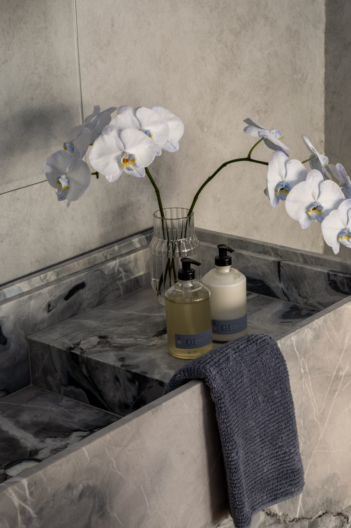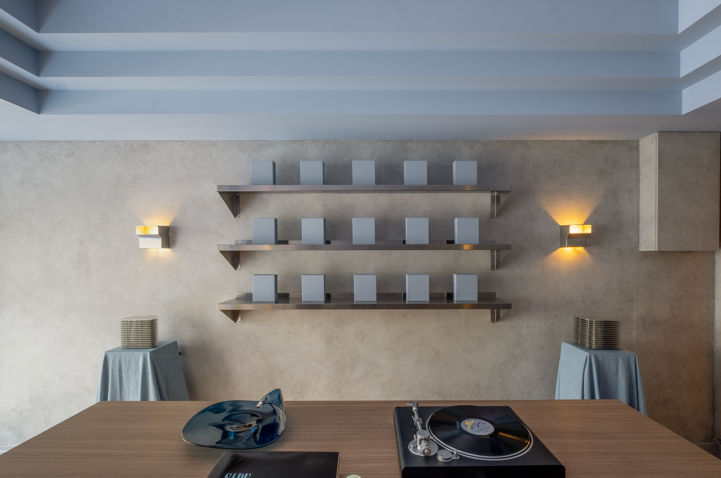 Beneath the stepped ceiling, the space opens into a central island — part fragrance bar, part record station, part communal table. It’s the beating heart of the store, designed not just to display but to host. The monolithic stone sink invites you to pause, wash, and experience scent slowly — like a ritual, not a routine. The vinyl turntable hums in the background. Time stretches.